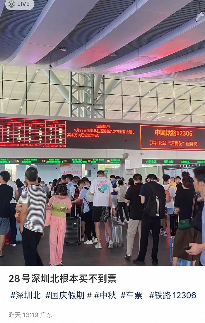9月28日,深圳北站发布提示,表示当日除前往香港西九龙方向有余票,其余方向已全部售完。也就是说,如果在现场买票,从深圳北站出发只有前往香港一个选择。因为抢从深圳出发去其他城市的高铁票太困难,有旅客选择先前往香港西九龙,再坐北上的高铁或飞机前往内地其他城市。