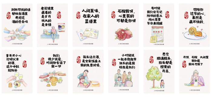 酒品类售卖区上方放着一张图,“童年不小心打碎父亲的酒,这个中秋给他补”、生鲜蔬菜区放着“人间至味,在家人的菜谱里”,挑选商品的顾客跟所摆放的插画一起,便又组成了一幅中秋过节图,在浓郁的过节氛围里多了一层温暖。