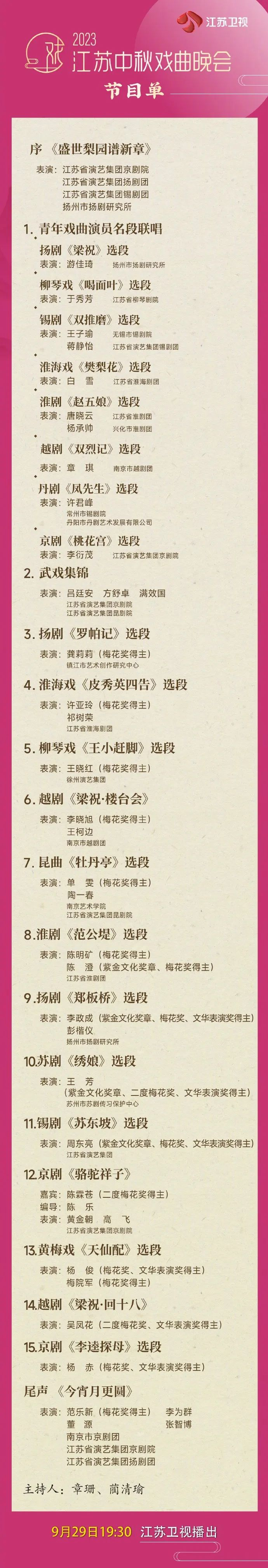 看点:晚会以“梨园薪火,时代华章”为主题,紧扣“中秋”和“戏曲”两大元素,将传统节日内涵与戏曲艺术融为一体。来自江苏省内外的30多位戏曲名家将带来精彩节目,其中十多位都是中国戏剧梅花奖获得者。此次演出的剧种也很丰富,包括京剧、昆曲、越剧、黄梅戏,以及锡剧、苏剧、扬剧、淮剧、淮海戏、柳琴戏、丹剧等江苏地方戏。节目内容既有《牡丹亭》《双推磨》等经典剧目,也有丹剧《凤先生》等展现时代精神的新编之作。
