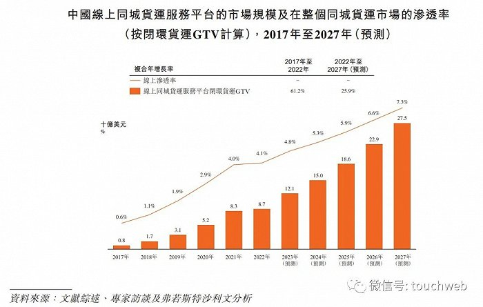根据弗若斯特沙利文的资料,目前,全球公路货运行业的在线渗透率仍较低,有巨大增长潜力。2022年公路货运GTV中仅有1.9%通过数字平台促成。在线渗透率预期将于未来五年跃升,达至2.7%。根据弗若斯特沙利文的资料,对于中国同城货运市场,在线渗透率预期将大幅提升,由2022年的4.1%升至2027年的7.3%。