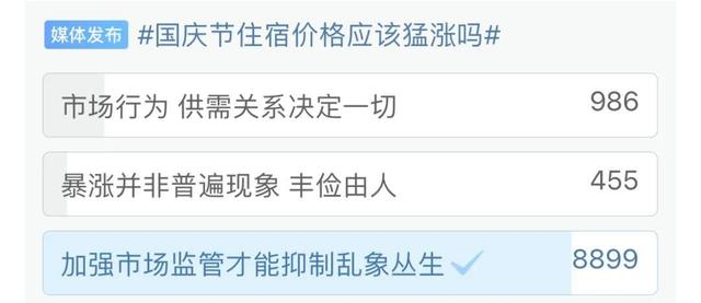 在微博上一项关于“国庆节住宿价格应该猛涨吗”的调查中,有八千多名网友认为,需要加强市场监管,抑制住宿价格乱象。