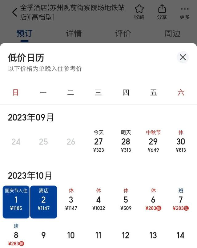全季酒店苏州观前街店,平常工作日期间大床房价格约每晚300元,国庆假期最高涨到每晚1185元;有网友反映,江西婺源一家新开业酒店的“豪华景观大床房”每晚价格已经由392元飙升至1393元,国庆节当天价格更是提升至2326元,涨幅近5倍。