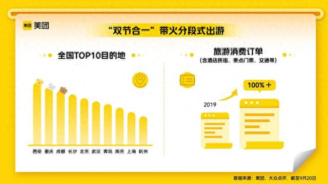 美团、大众点评数据显示,预计9月30日-10月2日为中秋节后首波出游小高峰,北京、成都、上海、深圳分别为出发与到达“双向”热门城市。同时,长途出游的住宿订单占比超过2019年同期,西安、重庆、成都、长沙、北京、武汉、青岛、南京、上海、杭州成为十大热门目的地城市,港澳、东南亚、日韩为热门出境游目的地。