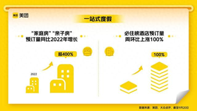 选择一个度假酒店或者乡村民宿深度体验,是都市人热衷的“住着玩”度假方式。以亲子家庭的假期刚需“遛娃”为例,截至9月20日,美团、大众点评上的“户外遛娃”搜索量同比增长超200%,“家庭房”“亲子房”的假期预订量同比增长超过400%。