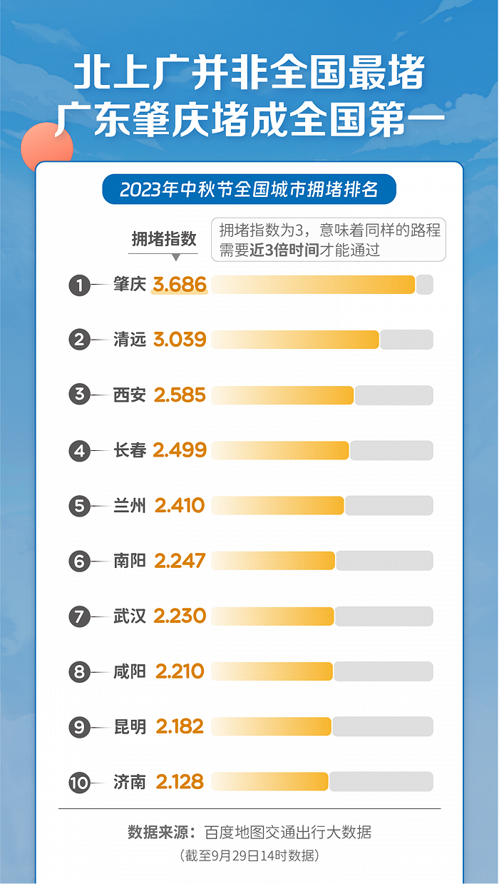 9月29日,百度地图发布交通出行大数据。数据显示,城市拥堵方面,广东肇庆、清远位居全国前二,拥堵指数均破3。意味着同样的路程,需要比平时超3倍时间才能通过,显示出大湾区节假通勤的交通压力。而陕西西安,也凭借2.5的拥堵指数,成为北方当前拥堵城市代表。北上广深等一线城市,其拥堵程度并未进入全国前十。