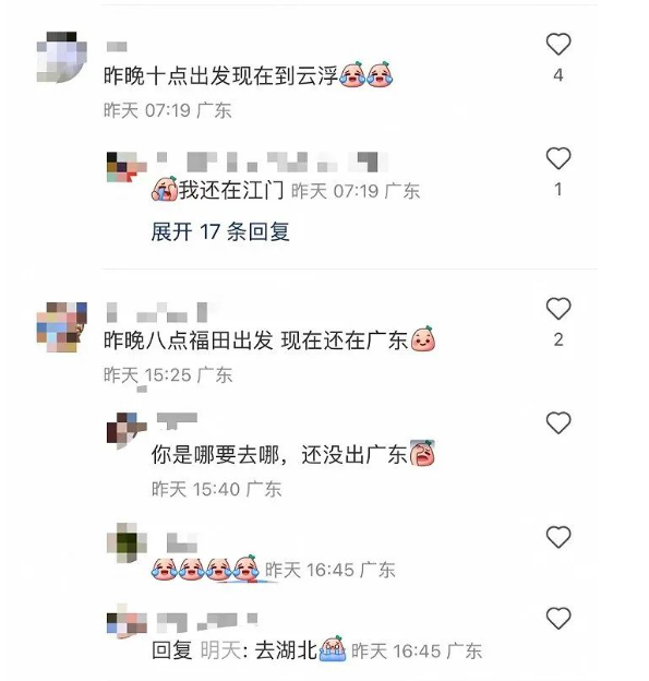 有车主在社交平台上表示,自己9月27日晚上8点从深圳市福田区出发前往湖北,9月28日下午3点半还没出广东,足足堵了19个多小时,从黑夜堵到白天。