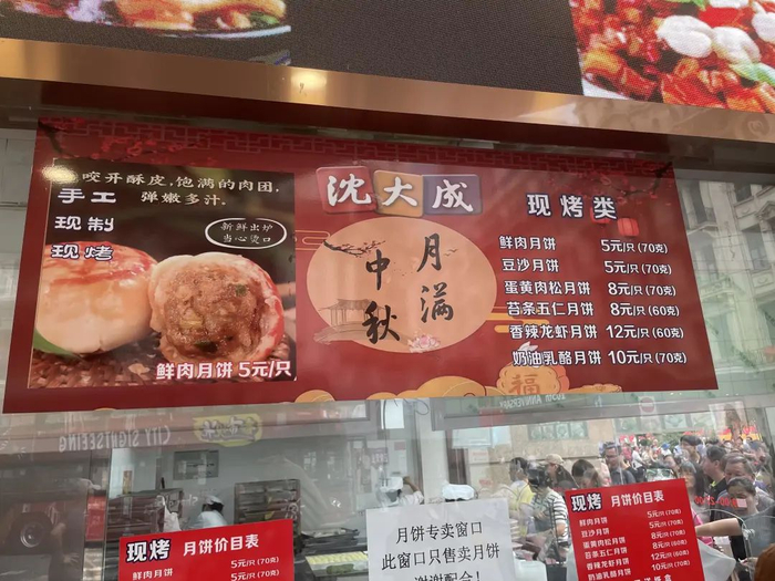 作为上海“糕团大王”,沈大成的鲜肉月饼同样很受欢迎。企业相关负责人介绍,其精选3肥7瘦黄金比例的新鲜猪肉,肉香浓醇,再搭配香葱佐料,将每一个月饼皮都塞得满满当当。再经过整整30分钟的烘烤,直至饼皮烤成金红色,还原酥脆掉渣的口感。“所有的鲜肉月饼都是现包现烤现卖,最近一天能卖出万余只。”
