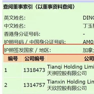 记者查询香港公司注册处信息发现,Xin rong Limited控股天欣控股有限公司,而“丁玉梅”在天欣控股有限公司担任股东,相关注册资料显示,“丁玉梅”持有加拿大护照。