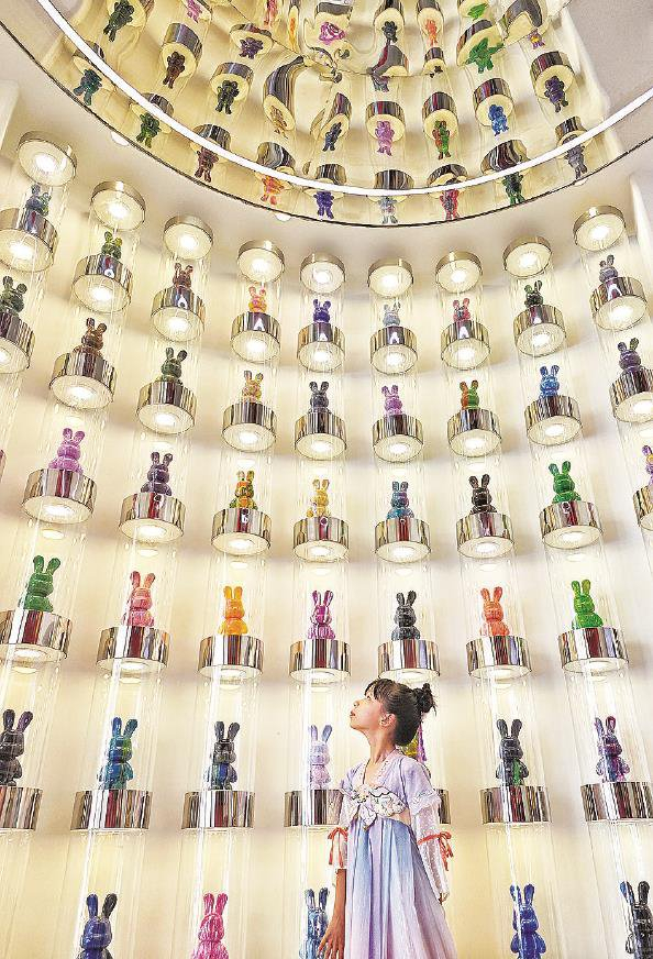 马利艺术空间距离金山嘴老街约500米,虽然面积只有200多平方米,但时尚打卡点可真不少。一进门,左手边一面由70只颜色各异的流体兔组成的艺术墙夺人眼球,每一只都是3D打印而成。中央,马利品牌的虚拟形象代言人马小利正骑着一匹小马。“这可是古风加国潮动漫。”侯彦萱指着马小利告诉记者。妹妹沈嘉萱则来到艺术空间最里面一角的小舞台,随着一曲《一笑江湖》跳起了舞,吸引了周围参观者的目光。
