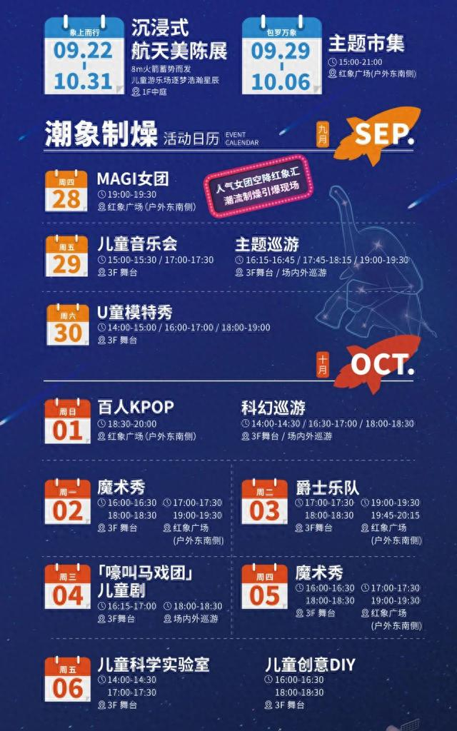 MAGI女团、儿童音乐会、百人KPOP、魔术秀、爵士乐队、儿童科学实验室……9月28日至10月6日,每天都有精彩表演陆续上演。其中,9月30日的“U童模特秀”将有150多组的摩登家庭来到现场,上演一场亲子大秀,展示“Z时代”家庭的风采