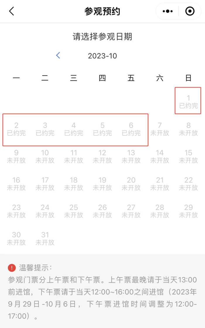 4、预约时段分为上午和下午。上午入馆时间9:00—13:00,下午入馆时间12:00—16:00。参观当日须按照预约时段入馆,错过预约时段将谢绝入馆。