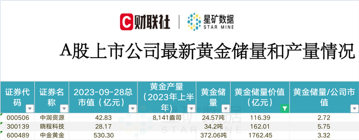 据财联社星矿数据统计,当前拥有黄金储量超20吨及黄金储量市值比超2.5的A股上市公司为中润资源、晓程科技和中金黄金,具体情况见表格如下: