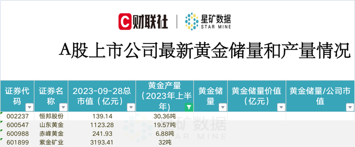 在黄金产能方面,据财联社星矿数据统计,今年上半年黄金产量超5吨的A股上市公司包括恒邦股份、山东黄金、赤峰黄金和紫金矿业,具体情况见表格如下:
