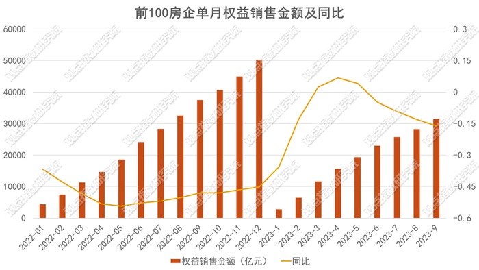 观点指数 “2023年1-9月房地产企业销售表现”研究成果显示,9月份前100房企实现权益总销售金额2849亿元,同比下降42.2%,环比上升12.6%。1-9月份,前100房企累计实现权益销售金额31095亿元,同比下降16.9%。