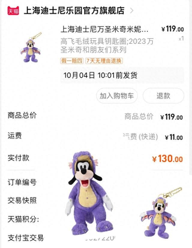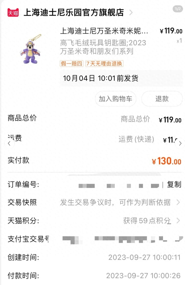 9月27日中午11点多,有网友晒出了上海迪士尼乐园官方旗舰店系列商品闪现上架图。官方显示10月4日10点01分前发货。手速快的网友抢到了。