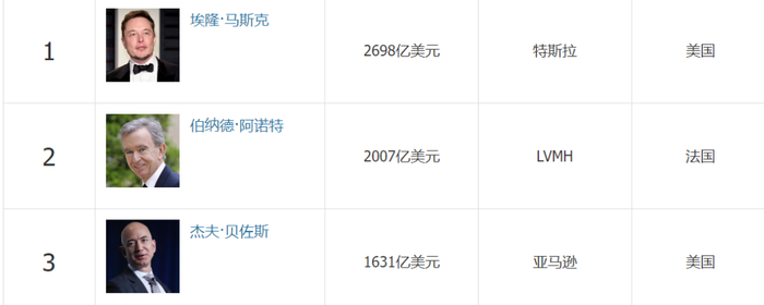 据福布斯实时富豪榜,截至9月30日,马斯克以2698亿美元(约合人民币2万亿元)稳坐世界首富宝座,阿尔诺以2007亿美元(约合人民币1.47万亿元)位居第二,而贝佐斯排名第三。