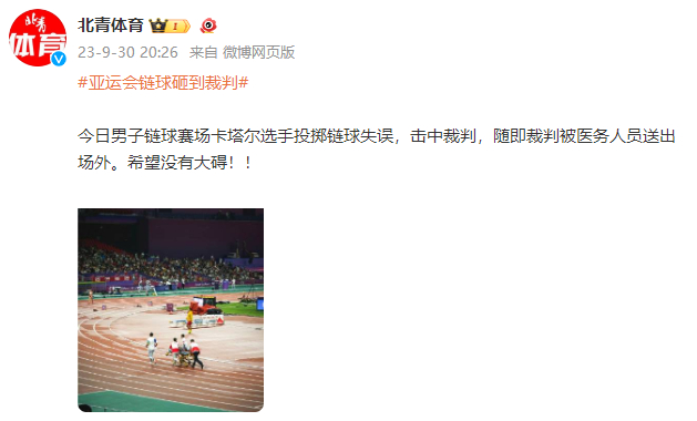 媒体:男子链球赛场卡塔尔选手投掷链球失误,击中裁判 环球网 环球网官方账号 2023.09.3021:06 关注 今日男子链球赛场卡塔尔选手投掷链球失误,击中裁判,随即裁判被医务人员送出场外。希望没有大碍。