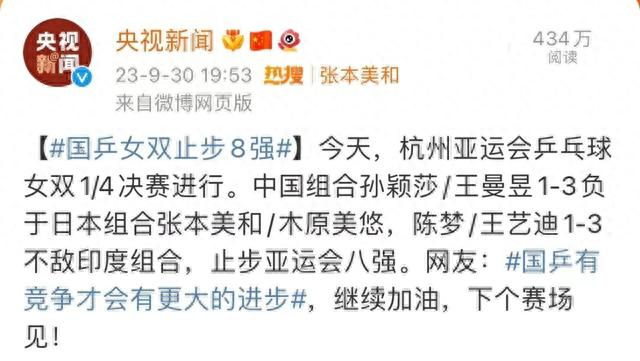 9月30日,杭州亚运会乒乓球比赛继续各单项争夺,国乒队孙颖莎/王曼昱、陈梦/王艺迪两对女双先后爆冷出局无缘4强。另一对男双林高远/梁靖崑也被淘汰。