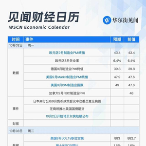 下周重点关注美国9月非农就业报告、9月ISM制造业、非制造业指数,欧元区9月制造业PMI终值、德国9月制造业PMI终值。