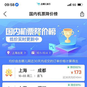 去哪儿旅行推出国内机票降价榜,实时更新低价机票,助力用户精准捡漏。记者查询发现,目前十一节中仍有不少低价机票。其中,上海出发捡漏性价比最高,如10月3日上海飞往成都的航班降幅达82%,裸票价格仅为173元,上海飞往深圳降价幅度达81%,为176元。北京出发,降价幅度最高的航班为长线旅行,其中北京飞往兰州、深圳的机票价格降幅为72%,10月2日,北京—兰州裸票价格仅为415元;广州出发,前往北京降价幅度最高,10月2日直飞裸票价格仅为356元。