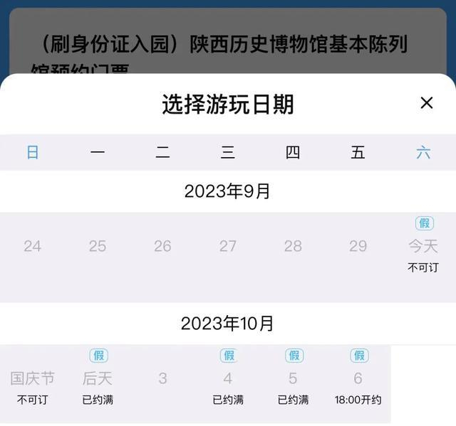 9月30日门票售出数量已经达到最大限量,根据目前后台数据显示10月1日—4日秦陵博物院门票已基本售罄,请及时调整您的行程安排。“我院在此提醒已经预约门票的观众,为了您获得较好的参观游览体验请务必按照预约时段前来参观。已购票预约观众如行程有变,请及时退票,帮助我们提高门票使用效率。”