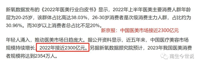 2022年,中国医疗美容市场规模进一步扩大至“惊人的近2300亿元”,继续领跑全球。今年,我国医美消费者规模预计可提升至2354万人,消费总金额有望实现2500亿元的突破。