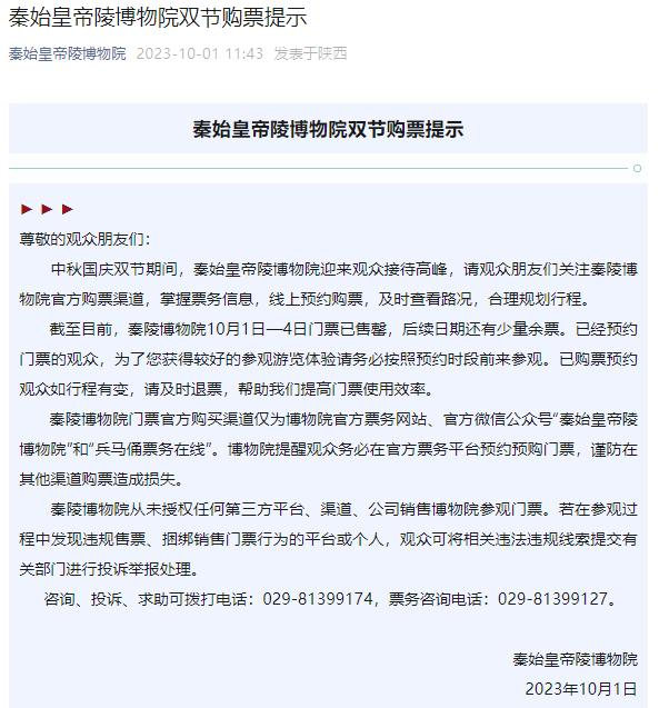 10月1日,秦始皇帝陵博物院官微发布消息显示,10月1日—4日门票已售罄。