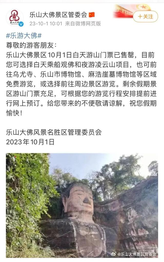 10月1日上午10时,乐山大佛景区管委会发布消息称,10月1日当天白天游山门票已售罄。