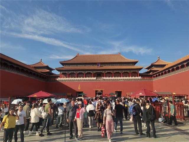 在午门广场安检口,距离停止检票时间还有半个小时,仍有不少游客排队进入。记者注意到,有十多名未成年人穿着红马甲在带队老师的引领下,通过安检进入故宫。据此前发布的《故宫博物院2023年中秋、国庆期间未成年人团队快速预约、检票措施》要求,故宫每日接待未成年人团队限400个,按邮件接收时间顺序,约满为止,预约结果将通过邮件通知申请单位。