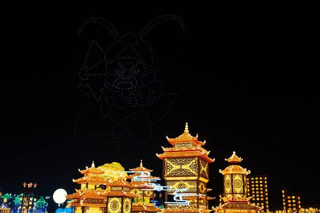 600架无人机在空中辗转腾挪、变换走位,展现自贡以盐龙灯为主的本土文化,一会儿变幻出两只恐龙,一会儿又变出一架高大的天车。