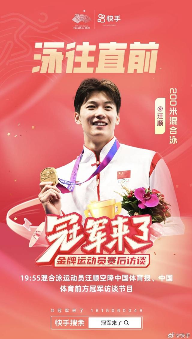 亚运会运动员访谈类节目《冠军来了》,是中国体育报,中国体育直播特别打造的金牌运动员赛后访谈,希望通过互动内容让老铁近距离感受金牌选手的力量与荣耀。除了本期嘉宾汪顺,节目还陆续邀请到邹佳琪、邱秀萍、陈烨、骆宗诗、毕焜、肖若腾、巩立姣等数十位冠军选手,讲述运动员的亚运征程与体育人生,展现中国体育健儿顽强拼搏、奋勇争先的精神面貌。