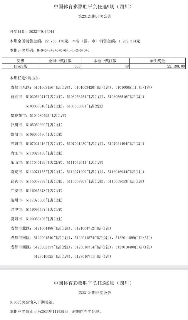 中国体育彩票胜平负任选9场第23124期全国销售金额22753176元。开奖号码:0+0+3+3+3+0+0+0+1+1+3+0+0+0。