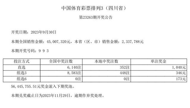 中国体育彩票排列3第23263期全国销售金额45007320元。开奖号码:9 9 3。