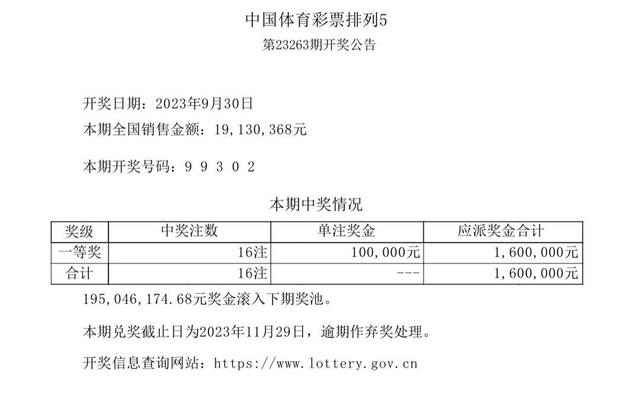 中国体育彩票排列5第23263期全国销售金额19130368元。开奖号码:9 9 3 0 2。