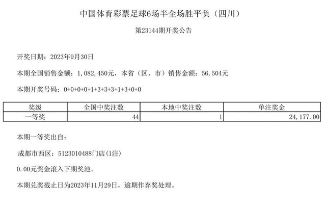 中国体育彩票足球6场半全场胜平负第23144期全国销售金额1082450元。开奖号码:0+0+0+0+1+3+3+3+1+3+0+0。