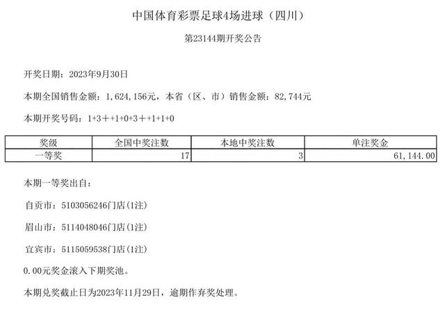 中国体育彩票足球4场进球第23144期全国销售金额1624156元。开奖号码:1+3++1+0+3++1+1+0。