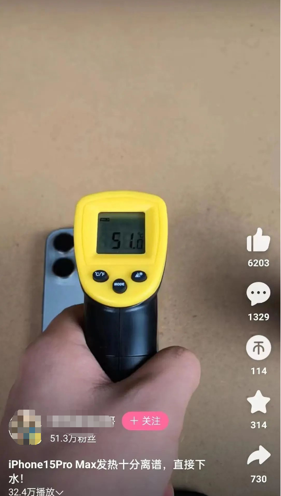 同平台的另一位up主称,用iPhone 15 Pro Max录制了十分钟的vlog后,机身温度达到了51摄氏度。