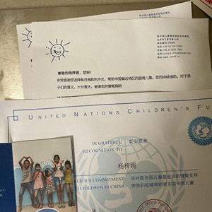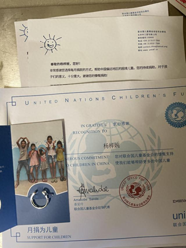 随后记者分别在一家7.99元和一家27.55元的商家下了单,商家分别发了申通快递和中通快递,收到了拆开外包装,里面均是一个顺丰信封,再打开则均是感谢信、证书、小蓝卡和戒指。其中感谢信写道“非常感谢您选择每月捐款的方式,帮助中国偏远地区困境儿童。您的持续捐助,对孩子们的意义,十分重大……”一份的落款为芮心月,联合国儿童基金会驻华代表;另一份的落款为桑爱玲,联合国儿童基金会驻华代表。记者注意到,两个商家的售价虽然相差3倍,但感谢信、证书除了落款和材质外几乎没有区别,小蓝卡和戒指和肉眼看不出区别。