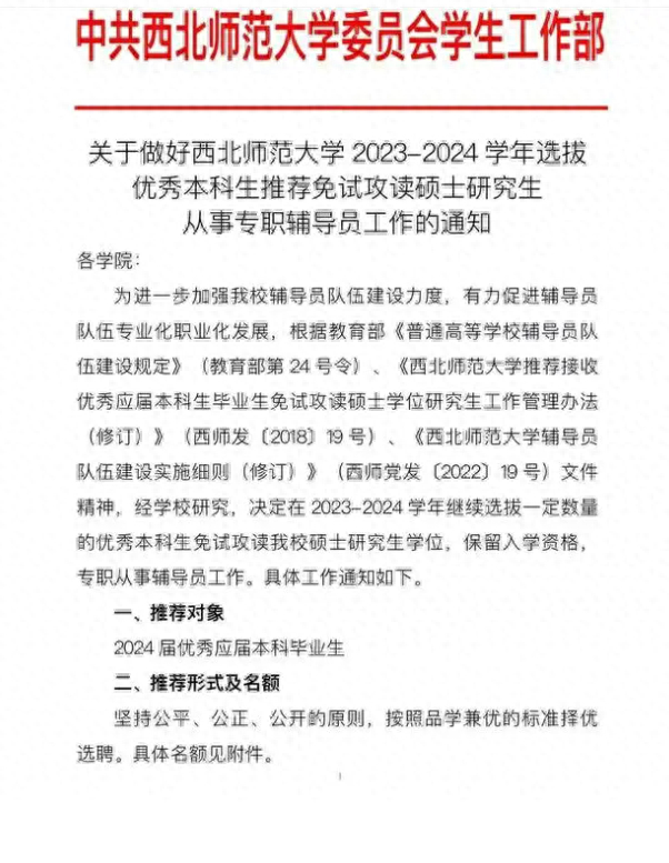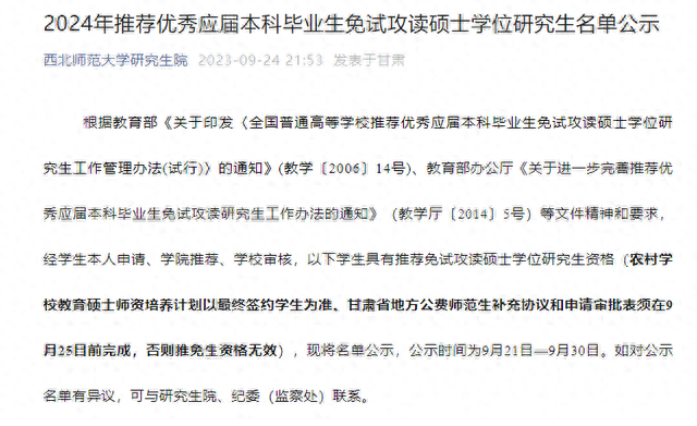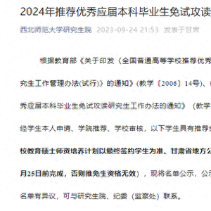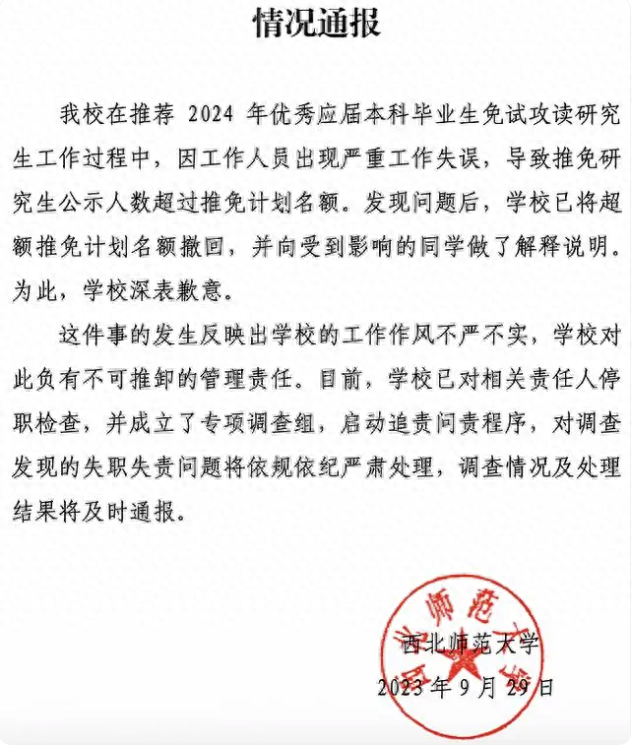 对于学生反映的问题,西北师范大学在9月29日发布的通报中称,该校在推荐2024年优秀应届本科毕业生免试攻读研究生工作过程中,因工作人员出现严重工作失误,导致推免研究生公示人数超过推免计划名额。发现问题后,学校已将超额推免计划名额撤回,并向受到影响的同学做了解释说明。通报还说,学校对这件事负有不可推卸的管理责任。目前,学校已对相关责任人停职检查,并成立了专项调查组,启动追责问责程序,对调查发现的失职失责问题将依规依纪严肃处理,调查情况及处理结果将及时通报。