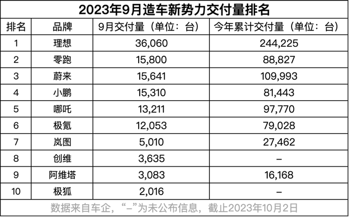 从9月的造车新势力榜单看,除了理想汽车突破3.6万台之外,绝大多数新势力都“卡”在1万-1.5万台月交付量的水平。像零跑、蔚来、小鹏更是以1.5万台的数据并驾齐驱,三者之间不过是几百台的差距。极氪和哪吒,则守住了1万+的“底线”。