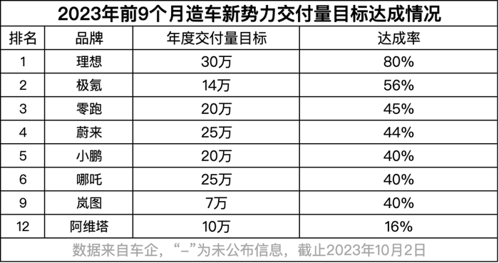 绝大多数的新势力,截止第三季度,仅完成了交付量目标的约40%。目前,差得最多的是阿维塔,年度交付量目标为10万台,但当前完成度仅为16%左右。