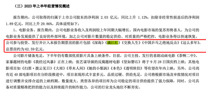 该公司上半年参与投资的电影项目包括《满江红》《深海》《交换人生》《中国乒乓之绝地反击》《这么多年》,总票房约为 62.59 亿元。公司电影业务收入及利润较上年同期大幅增长。《坚如磐石》在国庆档的出色表现或将进一步帮助光线传媒提升电影业务营收。