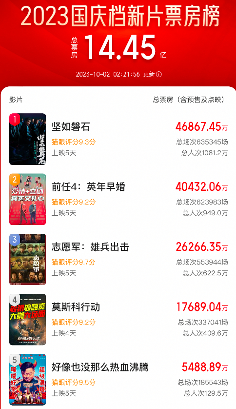 《坚如磐石》《前任4》《志愿军》《莫斯科行动》《好像也没那么热血沸腾》排名前五,票房分别为4.49亿元、3.9亿元、2.49亿元、1.66亿元、0.52亿元,评分分别为6.6分、7.2分、7.3分、6.5分、7.2分。