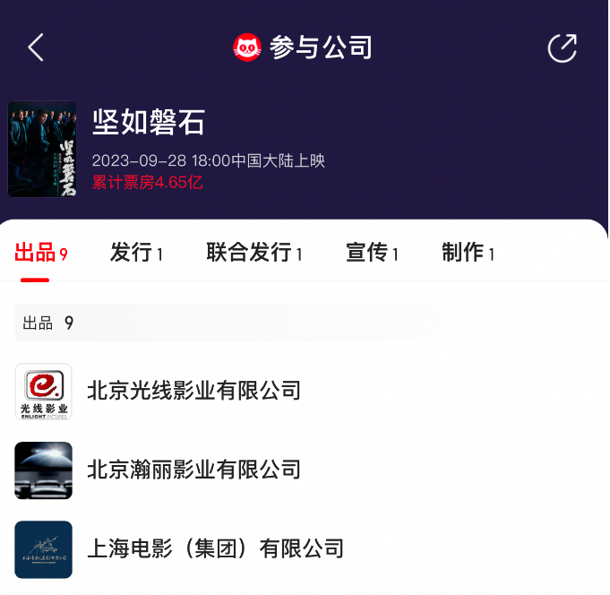 例如票房榜首的《坚如磐石》,出品方为光线影业、上海电影等上市公司,其中光线影业还负责影片的发行。