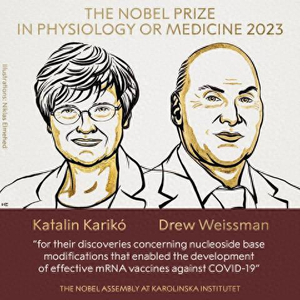 中新网10月2日电据诺贝尔奖官网消息,北京时间10月2日下午,2023年诺贝尔生理学或医学奖率先揭晓,科学家Katalin Karikó和Drew Weissman获奖,以表彰他们在核苷碱基修饰方面的发现,这些发现使针对新冠感染的有效信使核糖核酸(mRNA)疫苗的开发成为可能。