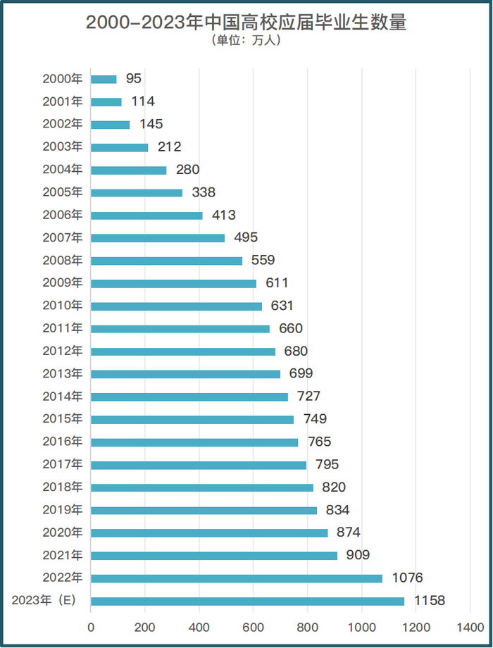 2022年高校毕业生达到1076万人,规模和增幅都是历史新高。而2023年,这个数字将达到1158万人。