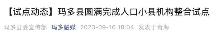 假期前,青海省果洛藏族自治州玛多县宣布,圆满完成人口小县机构整合试点。