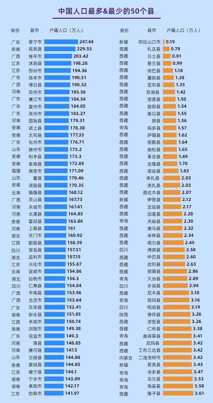 而人口最少的新疆阿拉山口市只有1878人,和排在第一位的普宁市差距高达1320倍。