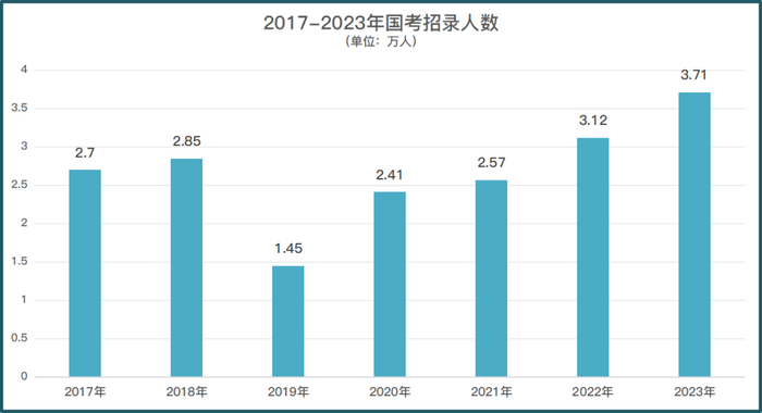 国考招录人数,从2019年开始连年上升,2022/2023年已经连续两年突破3万人。