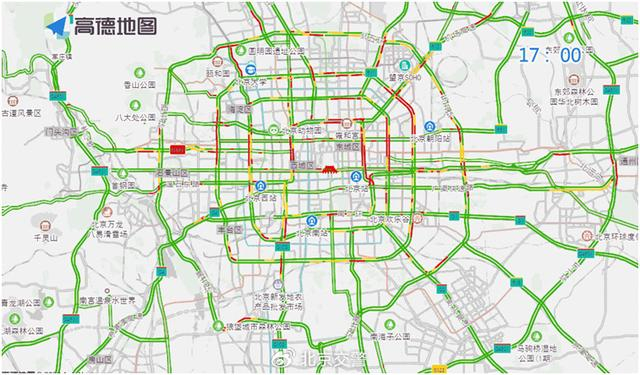 晚高峰期间,东、西、北二、三、四、五环,东六环部分路段,以及万泉河路至圆明园西路、通惠河北路、莲石东路等城区道路出城方向车流集中,京藏高速、京承高速、京通快速、京港澳高速、机场高速等高速公路出京方向车流量大。